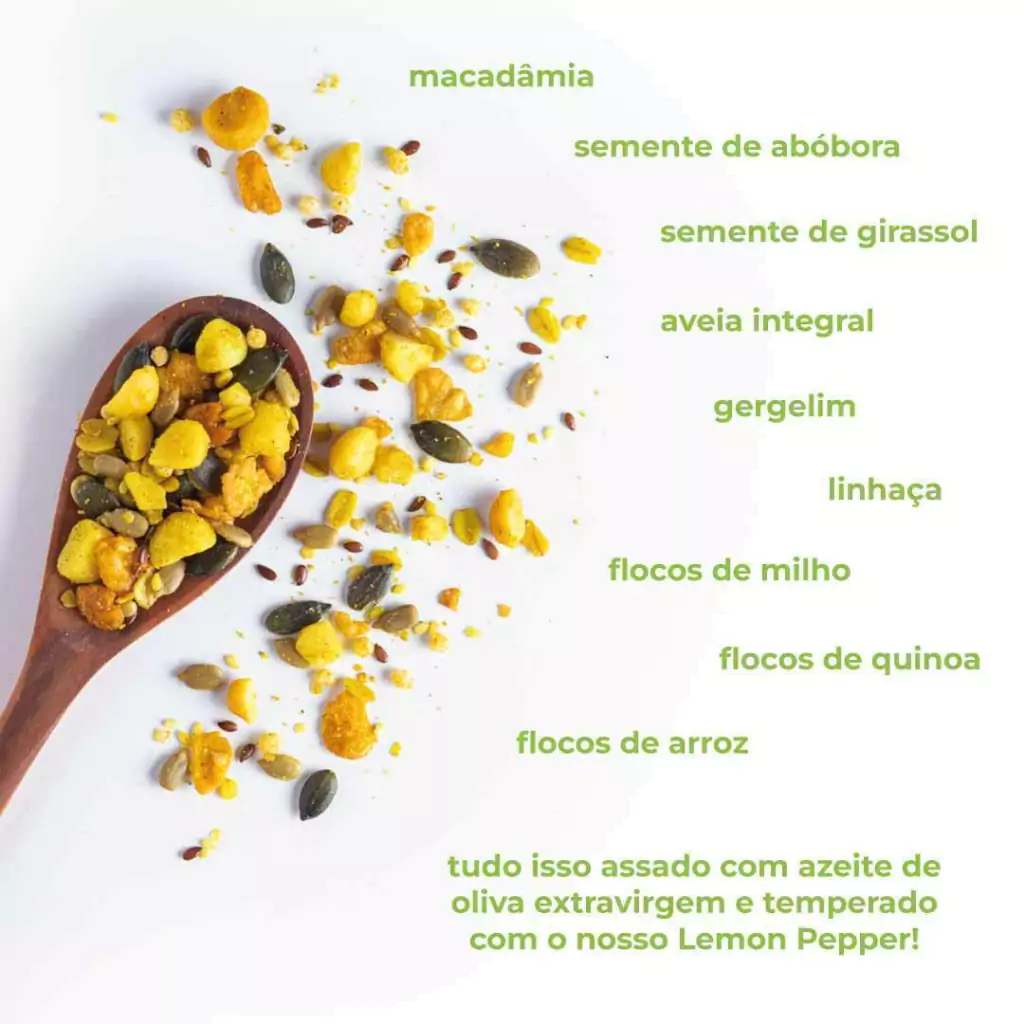 Deliciosa granola salgada temperada com nosso Lemon Pepper e feita com muita, muuuuita macadâmia, a rainha das nozes! Super nutritiva, contém também sementes, aveia integral e é assada com azeite extravirgem para ficar bem crocante.